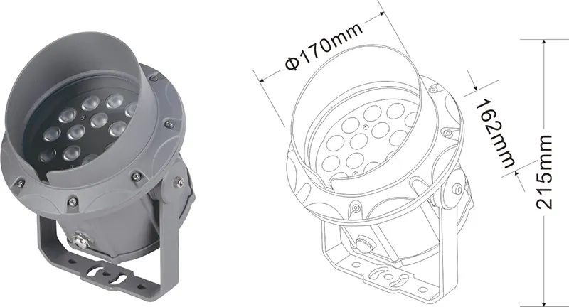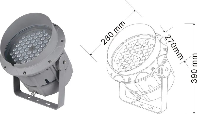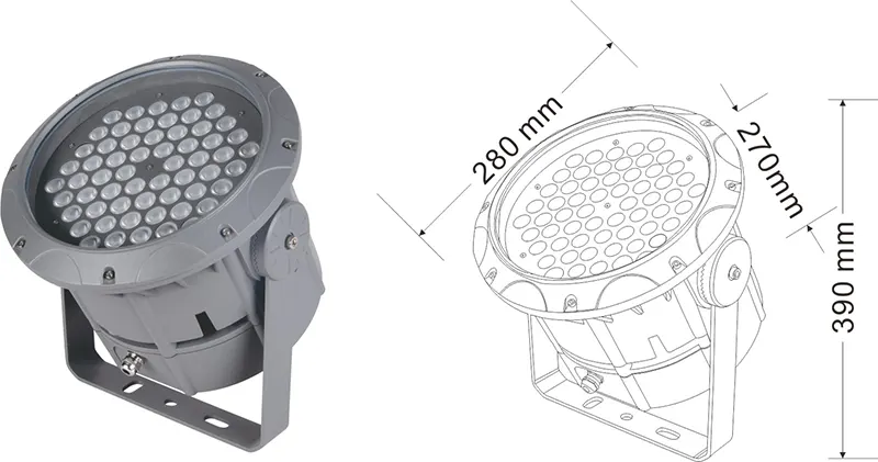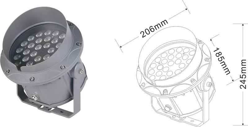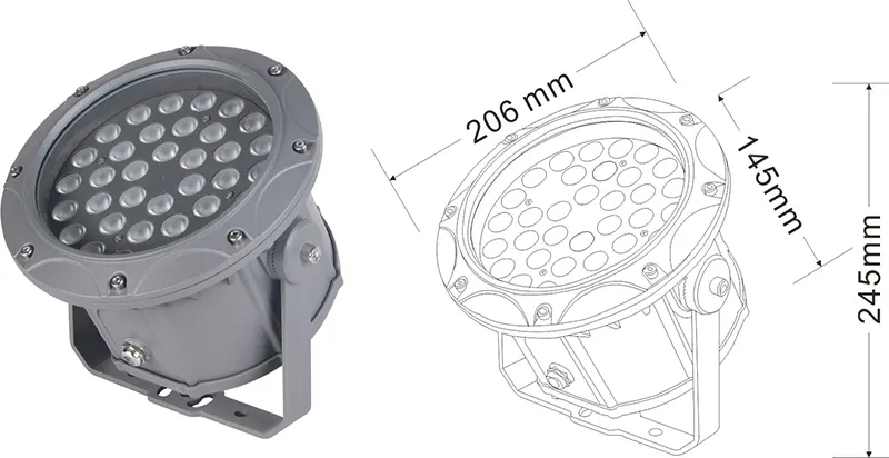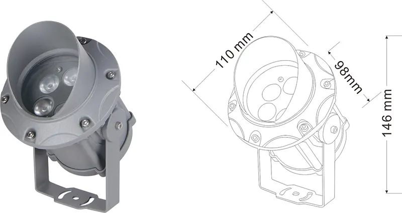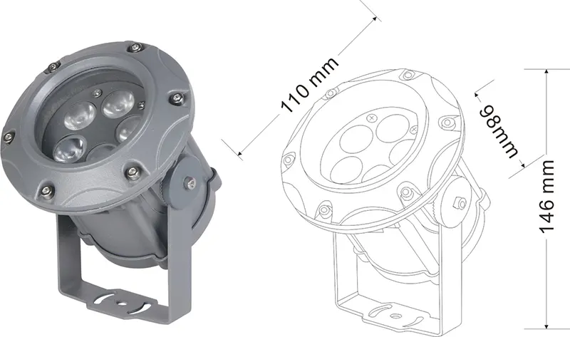 | Spotlight LED | CON-TGD01-1 | D110*98*46mm | 5W | Material: alumínio+vidro temperado Tipo de suporte: ajustável IP: IP67 Temperatura de cor opcional: 3000K/4000K/6500K RGB / DMX512 RGBW / DMX512 Cinza convencional, personalizável para combinar com a cor da fachada da construção |